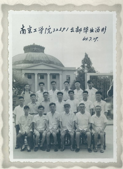 南京工学院32591支部毕业留影(前排右三为时任院党委书记刘雪初、右二为院领导杨德和,右一为院领导黄海宽,第二排左二为王家骏)