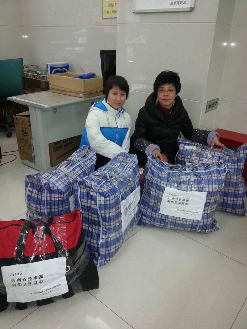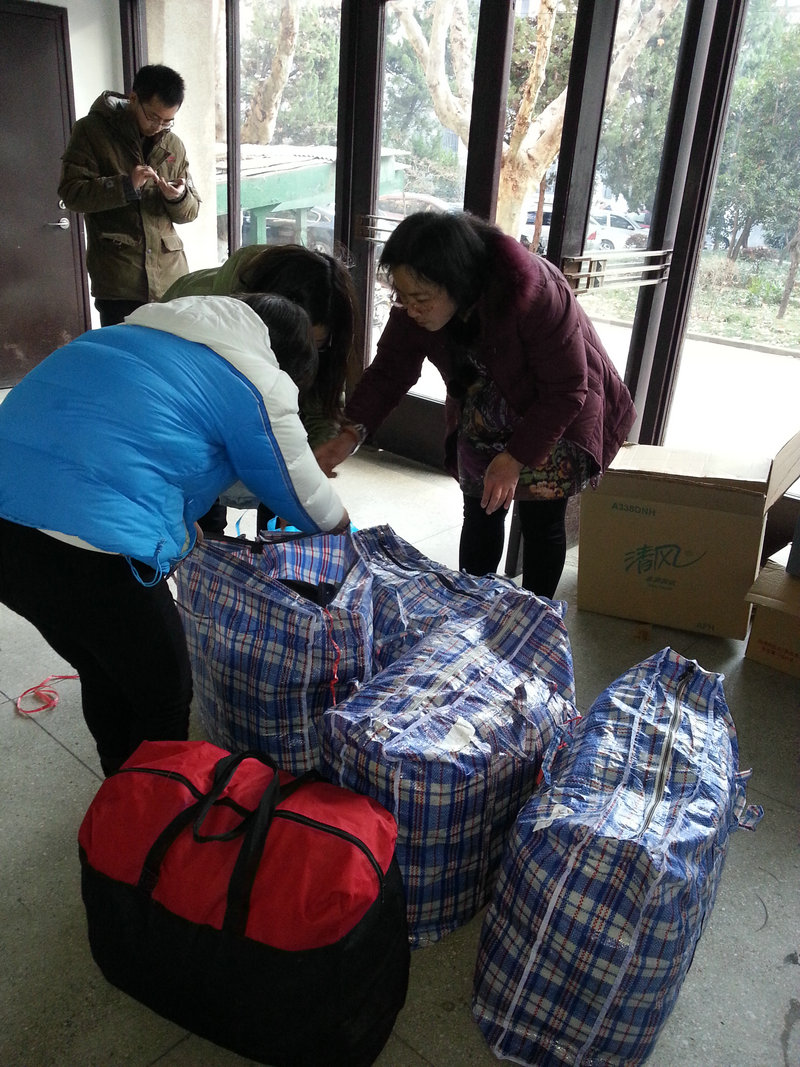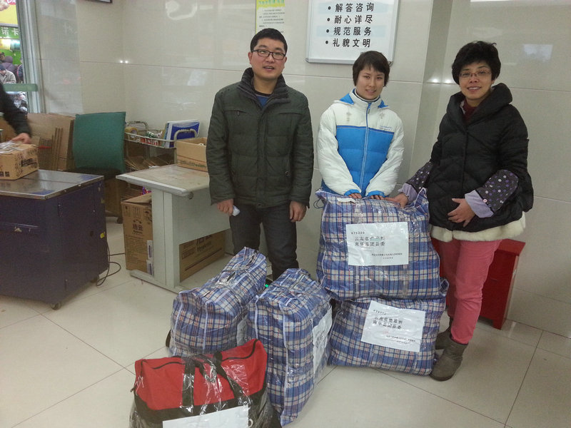 倡议发出后,迅速得到全馆各科室馆员的积极响应。在较短的时间里,档案馆馆员捐出各类冬衣、棉鞋、棉被、书包共计五大包裹。由何老师亲自驾着三轮车,将全体馆员的爱心运送到邮局,张慧慧、张魁老师负责封装包裹、贴运单号。