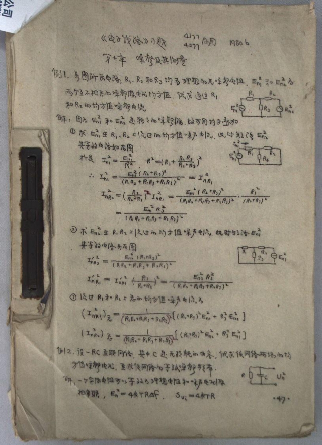 1977年,国家开始恢复高考。据胡光校友回忆,由于当时入学比较仓促,条件有限,没有正式的教材,部分教材都是老师们辛辛苦苦手刻、油印而成。其中,供4177、4277届使用的《电子线路习题册》便是由当时41教研室的谢洪熏老师亲手刻写、油印,直到今日依旧笔迹工整、图示清晰。