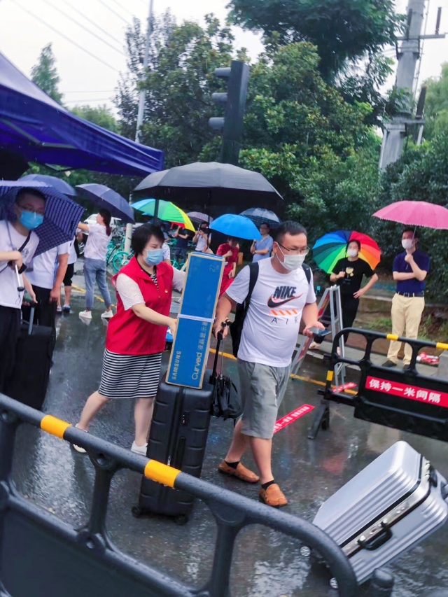 由于疫情原因,2020年春季有很多同学都未能返校,为迎接2020年8月8号和9号秋季大批量学生返校,校机关党委组织号召机关同志争当“红马甲”志愿者,为学生返校服务。档案馆李莉、李宇青、黄平等三位同志积极报名,参与到服务学生返校工作的第一线。他们在各组组长的带领下承担了学生进校门时的引导、行李搬运、沟通协调等工作。由于本次学生返校人数多、行李相对也多,“红马甲”志愿者不论男女老少都冲锋在前,不惧突遇暴雨,在雨中穿梭忙碌,主动帮学生将行李往接驳车上运递,全然不顾汗水和雨水湿了又干,干了又湿,无声的行动传递着教师的关爱和温暖。