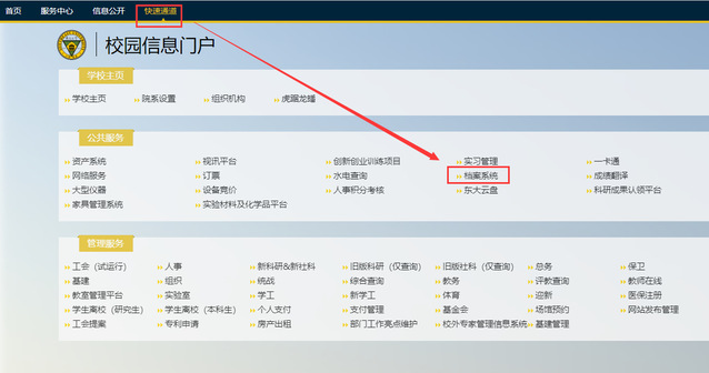 第二步:先点击页面左上方的“快速通道”,再点击下方“公共服务-档案系统”:
