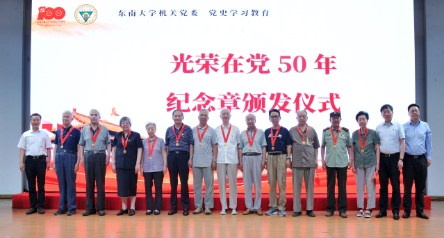校机关党委根据上级党委精神表彰了一批党龄超过50年的优秀老党员 ,97名机关党员荣获“光荣在党50年”纪念章,校党委副书记郑家茂,校党委副书记、纪委书记任利剑,校党委副书记刘攀为他们颁发了纪念章并和他们合影留念。档案馆朱绍民、董振娥、王全德、丁淑贞、夏家怀、朱秀英等六位老党员同志荣获此章,董振娥、朱绍民同志亲临现场参加了纪念章颁发仪式。