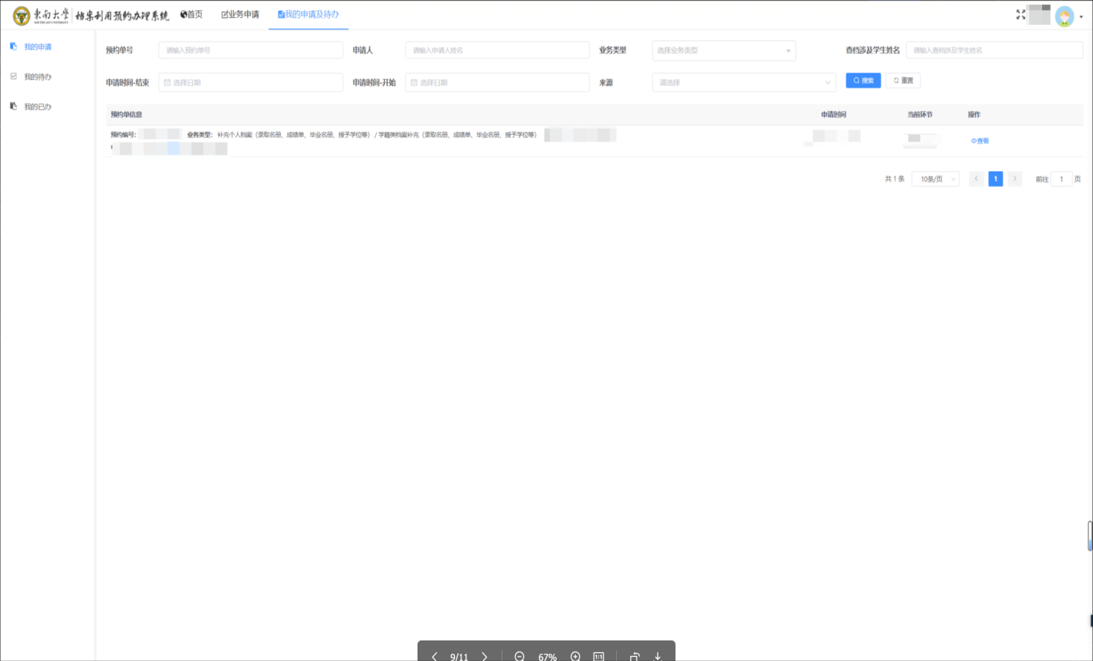 点击我的申请及待办查看预约单列表(如果没有预约单请绑定对应手机号) |