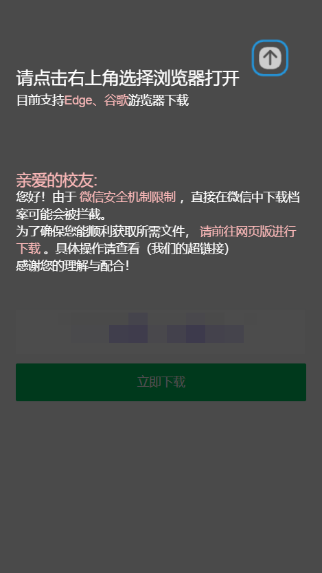 微信安全机制限制,直接在微信中下载档案可能会被拦截。所以会出现提示校友打开游览器下载的提示。点击右上角三个点打开游览器打开。并使用使用账号密码(需先注册账号并设置密码),或者是统一身认证登录,再绑定微信端使用的手机号。(用于系统同步预约单)再执行上述下载办理结果文件
