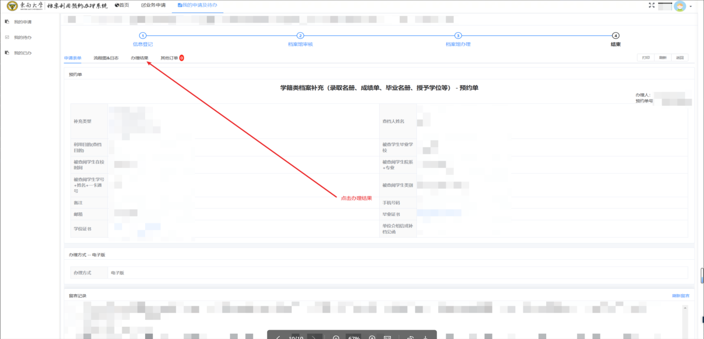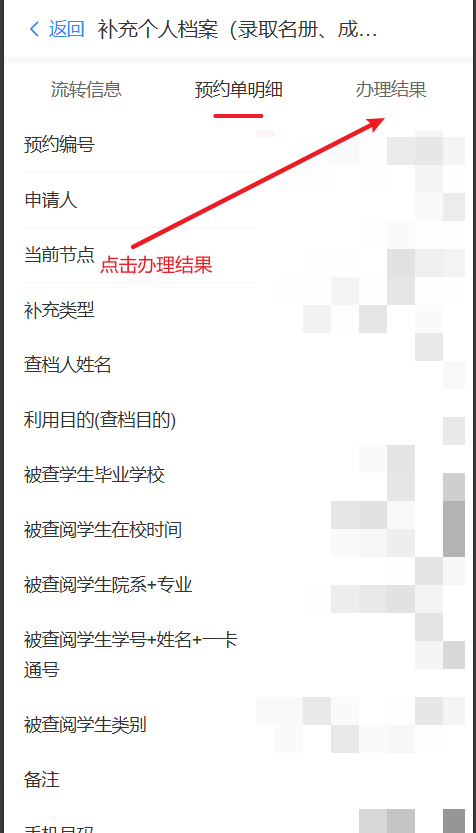 进入预约单详情,点击办理结果进入办理结果页面